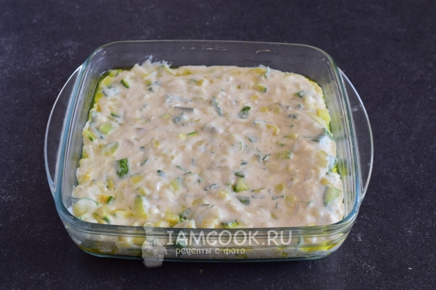Форму для запекания смазать растительным маслом или застелить пергаментом. Выложить кабачки в заливке в форму и разровнять.