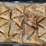 Готовые изделия выложите на противень швом вниз. Чтобы ничего не прилипало и не пачкало противень, лучше использовать пергаментную бумагу, которую после выпечки можно выбросить.