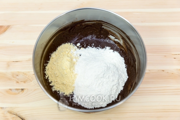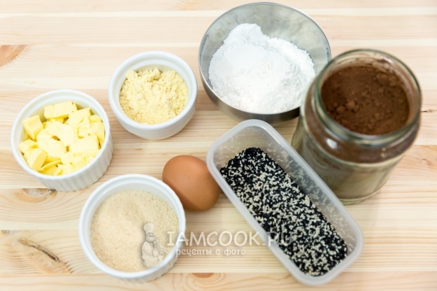 Для приготовления шоколадного печенья с кунжутом и кукурузной мукой подготовим продукты по списку.