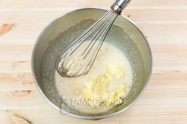 Яйцо слегка взбиваем с сахаром и солью. Добавим мягкое сливочное масло и вновь взбиваем.