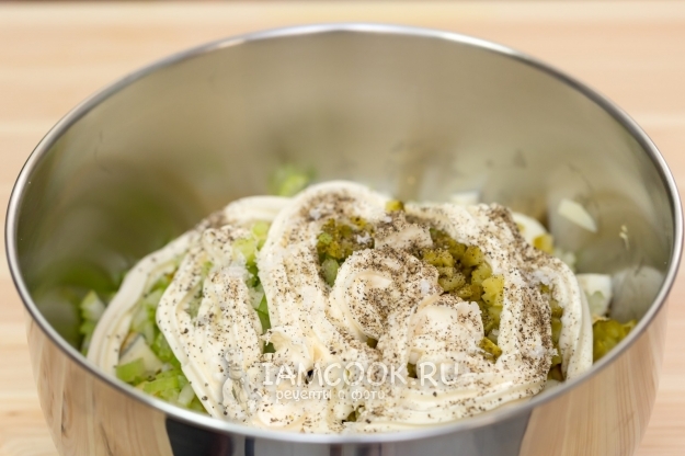 Добавим майонез, соль и перец.