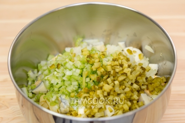 Сельдерей, корнишоны и лук нарежем очень мелко. Выкладываем к картофелю.