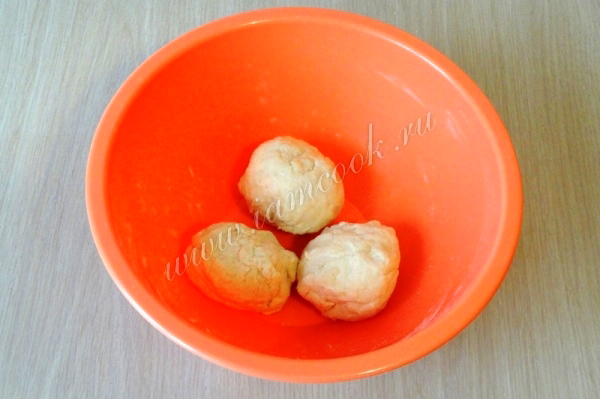 6. Замесить гладкое тесто. При необходимости добавляйте понемногу оставшуюся муку. Разделить тесто на три части. Поставить тесто в холодильник минут на 10.