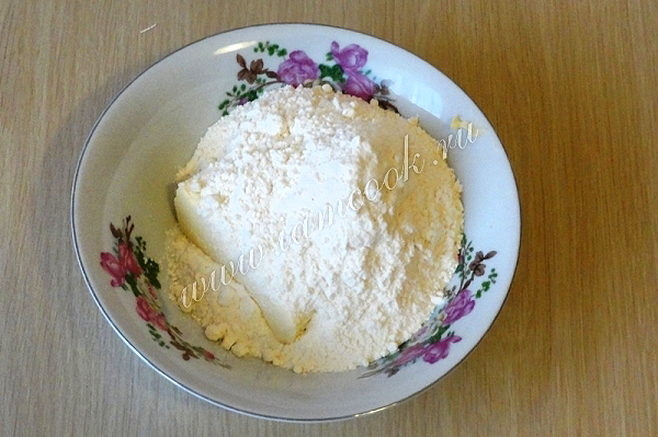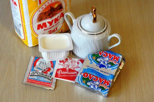 1. Необходимые продукты: мука, сахар, масло сливочное, дрожжи, сметана, ванилин, соль. Для начинки у меня дольки яблок из варенья и для обсыпки - сахарная пудра.
