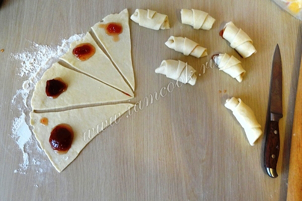7. На присыпанном мукой столе раскатать тесто в пласт толщиной 3-5 мм. Разрезать на сектора. Выложить начинку и свернуть от широкого края к узкому.