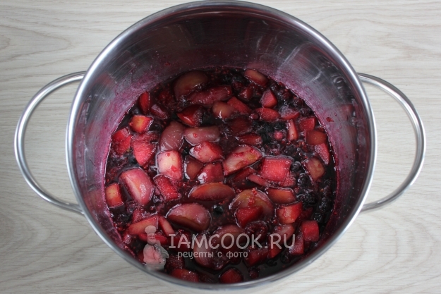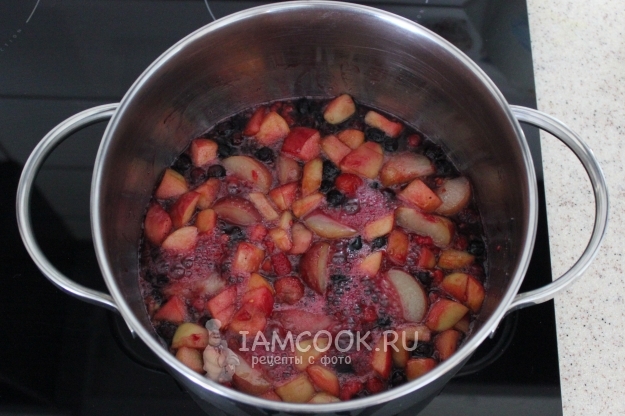 Снимите пену, убавьте огонь до среднего и варите варенье ассорти из замороженных ягод и фруктов около получаса.