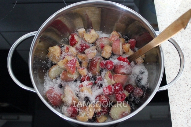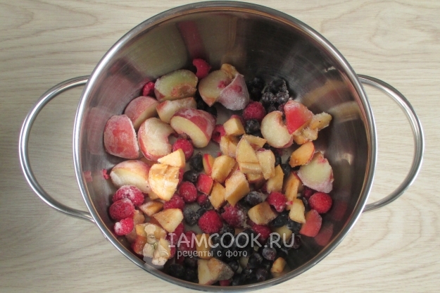 Поместите замороженные ягоды и фрукты в кастрюлю.