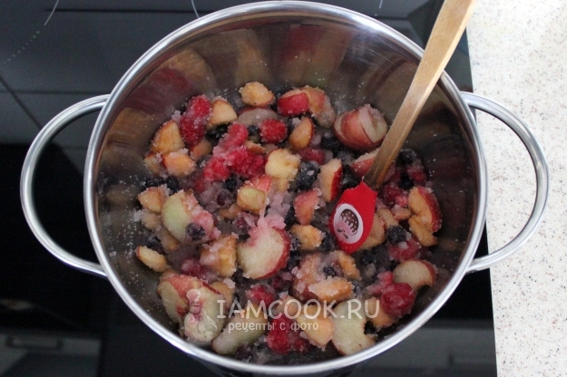 Через несколько минут ягоды и фрукты начнут размораживаться и выделять сок. Поэтому периодически перемешивайте.