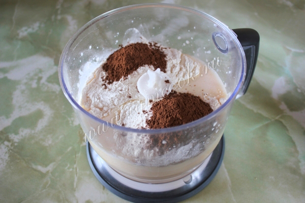 Затем добавляйте муку, какао, гашеную соду, перемешайте и замесите пышное мягкое тесто.