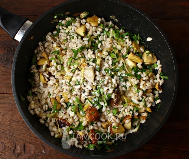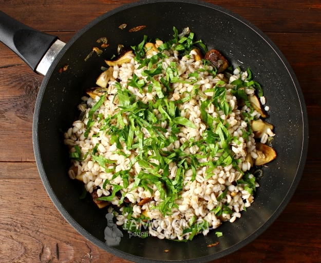 Добавляем отваренную перловую крупу, измельченную петрушку, перец и соль. Размешиваем.