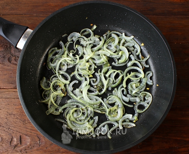 В сковороду наливаем масло, кладем лук, нарезанный полукольцами, и жарим на умеренном огне 3 минуты, помешивая.