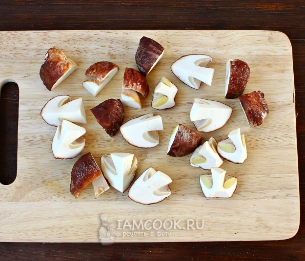 Лесные грибы, у меня белые, очищаем от мусора, промываем под проточной водой, крупно нарезаем и сразу отправляем в кастрюлю с кипящей водой. Отвариваем 10 минут, затем откидываем на дуршлаг.