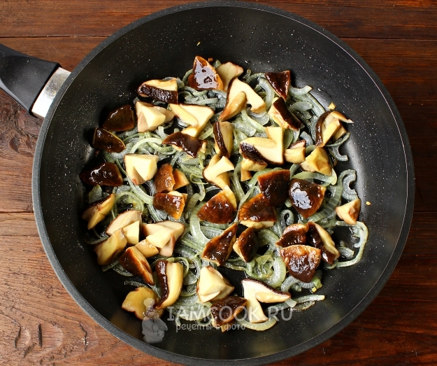 В сковороду к луку добавляем грибы и измельченный чеснок. Продолжаем жарить, помешивая, 4-5 минут.