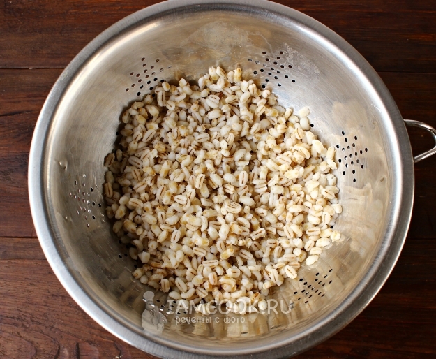 Перловую крупу промываем, заливаем водой на 1-2 часа. Затем снова промываем и отвариваем в слегка подсоленной воде до готовности, откидываем на дуршлаг.