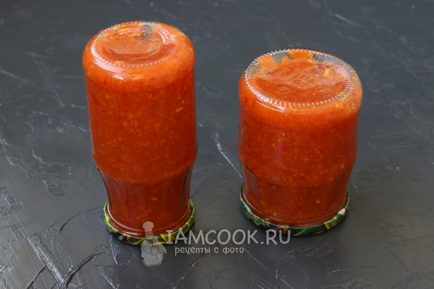 Горячую аджику разложить в сухие стерильные банки и закрутить. Перевернуть дном вверх и укутать до полного остывания.