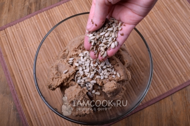 Смешаем и добавим семена льна и подсолнечника в тесто, оставив немного для украшения сформованных изделий. Еще раз перемешаем тесто, чтобы семена равномерно распределились в нем.