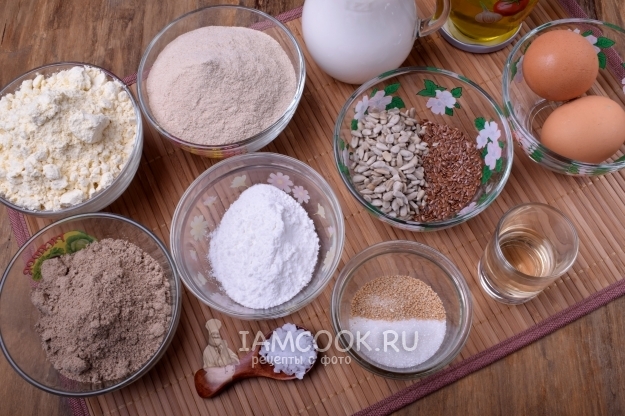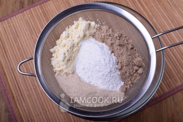 Пока дрожжи активируются, соединим и просеем всю муку с солью в посуду для замешивания теста.