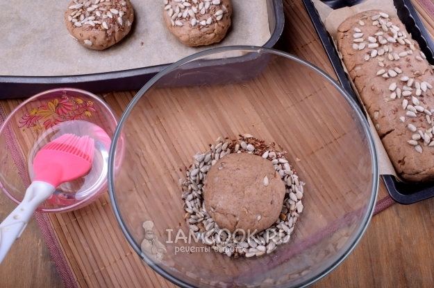 Смажем поверхность буханки водой и присыплем семенами, слегка прижав их рукой к поверхности, круглую заготовку можно опустить в смесь семян, также предварительно смазав поверхность теста водой.