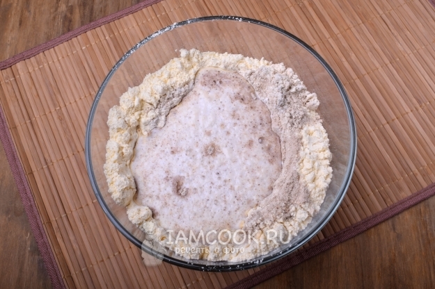 В мучной смеси сделаем углубление и выльем в нее дрожжевую и яичную смеси.