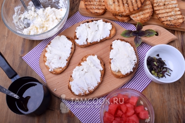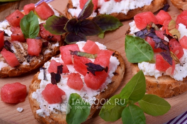 Наверняка, многие знают о салате с арбузом и фетой, я предлагаю по мотивам этого салата приготовить брускетту. Это игра контрастов: соленая фета и сладкий освежающий арбуз. А завершит картину заправка из меда и бальзамического уксуса, которую по желанию можно выпарить до состояния густой глазури.