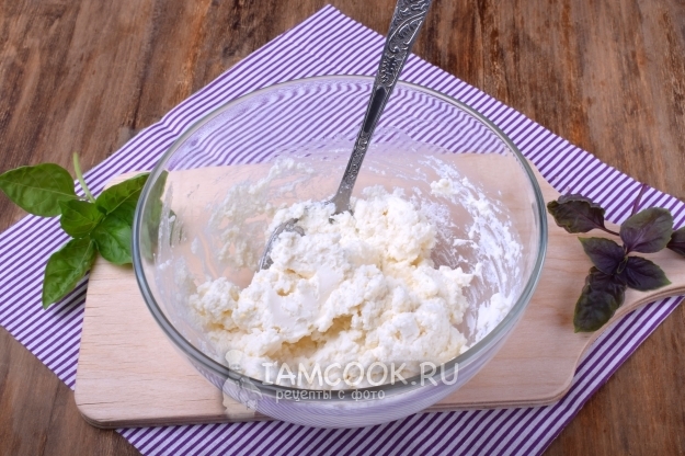 В глубокой мисочке смешаем фету и рикотту и разотрем их до кремообразного состояния. Это можно сделать ложкой, если фета мягкая, или блендером, если сыр «не поддается» ложке.