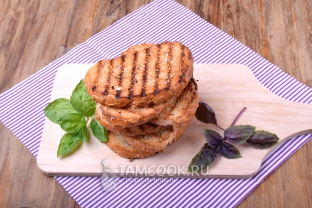 Ломтики хлеба подсушим на сковороде-гриль или в духовке до хрустящего состояния и дадим им немного остыть.