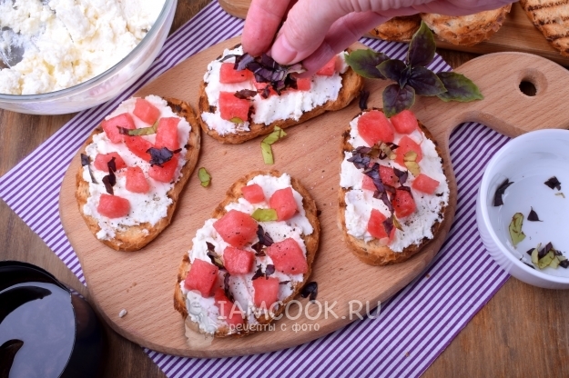 Сверху выложим кусочки арбуза, посыплем мелко нарезанным базиликом. По желанию брускетты можно немного приправить солью для усиления вкуса и молотым перцем для пикантности.