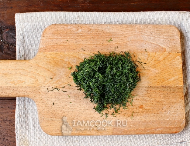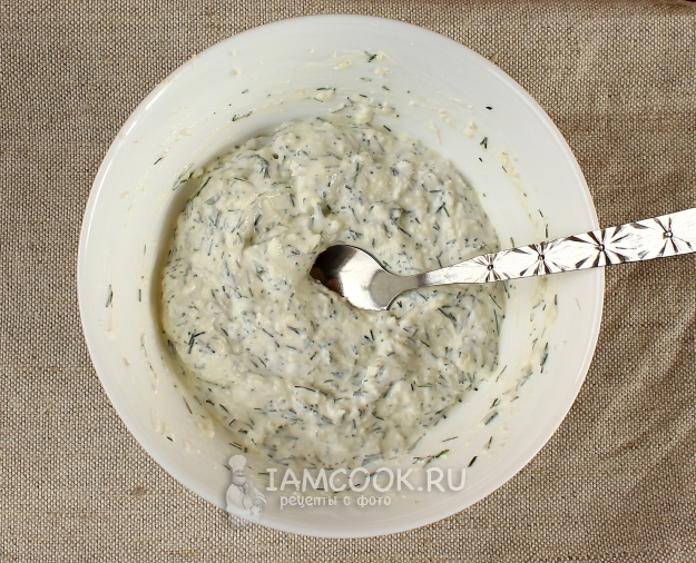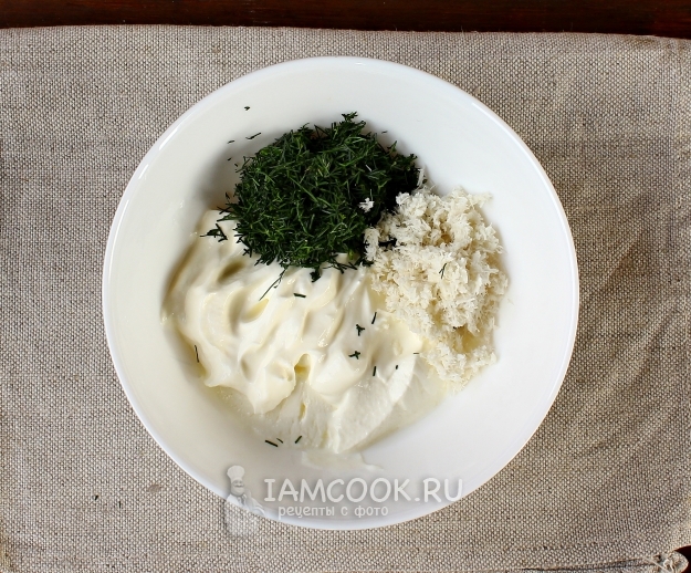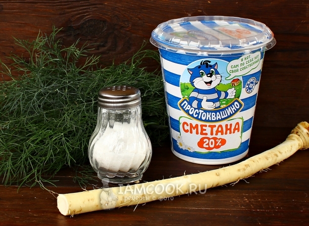 В миску выкладываем сметану, всыпаем измельченные хрен и укроп, перемешиваем до однородности.