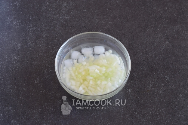 Высыпать лук в миску с водой и льдом и оставить на 20 минут.
