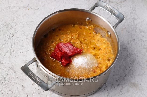Затем добавьте соль, сахар, растительное масло и томатную пасту. Тщательно перемешайте и тушите икру ещё 15 минут.