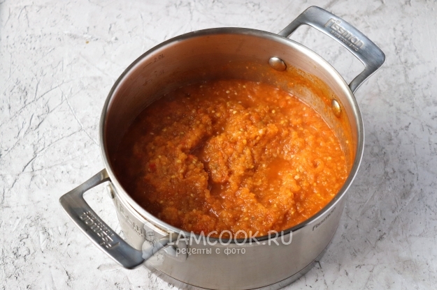 Овощную массу перелейте в варочную кастрюлю и отправьте на огонь. Доведите до кипения и варите на небольшом огне 20 минут, не забывая периодически помешивать.