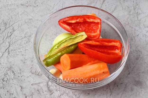 Морковь, лук, перец и чеснок очистите. У перца удалите семенную коробочку. Нарежьте овощи произвольными кусочками.