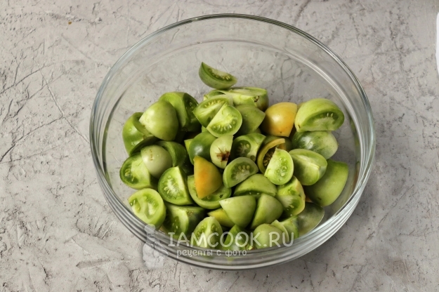 Помидоры помойте и оборвите хвостики. Просушите и разрежьте пополам или на четыре части, в зависимости от размера плода.