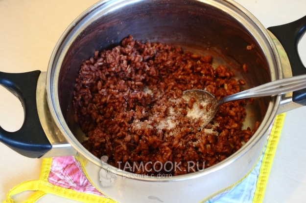Рис «Рубин» лучше предварительно замочить на 30 минут. После чего промыть и варить в 1,5 стаканах воды до впитывания жидкости. Готовую крупу солим.