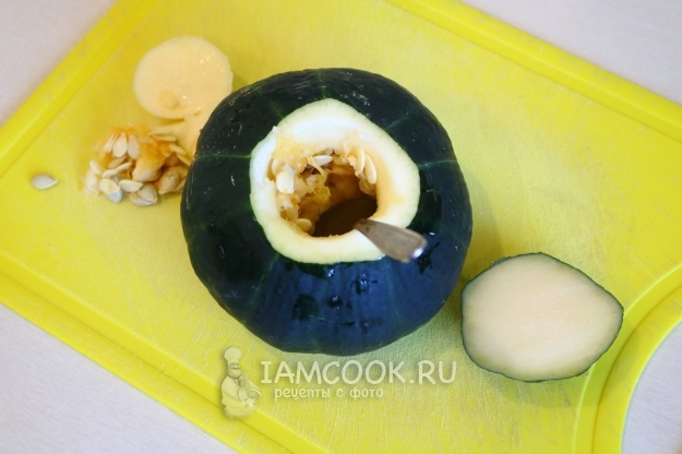Патиссоны промываем, срезаем верхушку и чайной ложкой вычищаем семечки. Можно захватывать и мякоть, так как чем больше вы сделаете полость в патиссоне, тем больше начинки уместится.