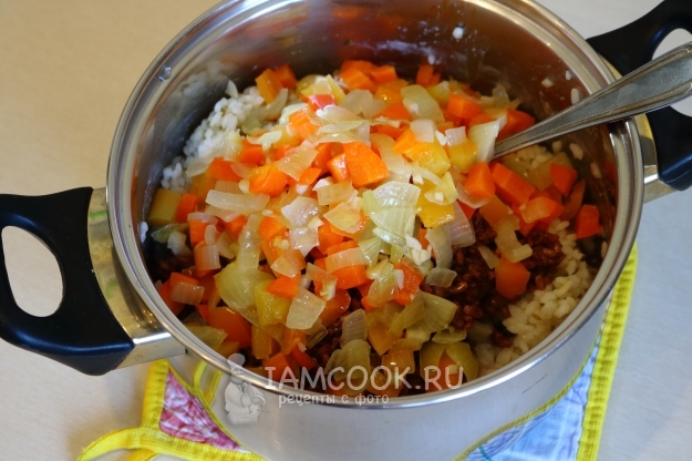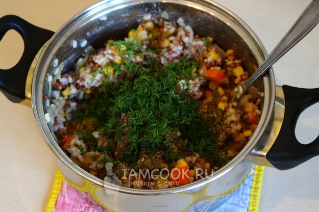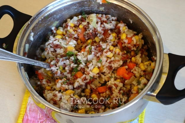 Все компоненты начинки готовы. Соединяем круглый и красный рис, а также тушеные овощи в удобной кастрюле/миске.
