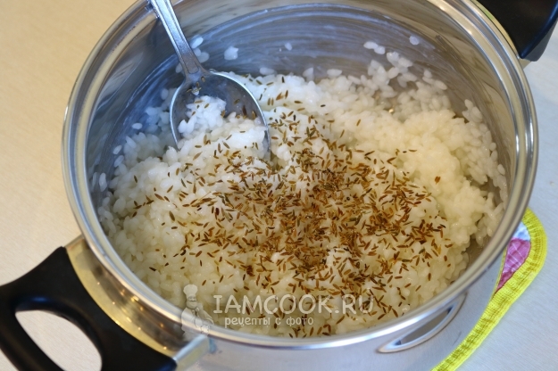 Круглый рис отвариваем также в двух стаканах воды. Всыпаем в готовую крупу зиру.