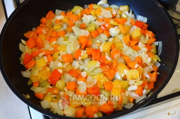 Выкладываем подготовленные овощи в сковороду с растительным маслом, немного солим и тушим около 10 минут на небольшом огне до полуготовности.