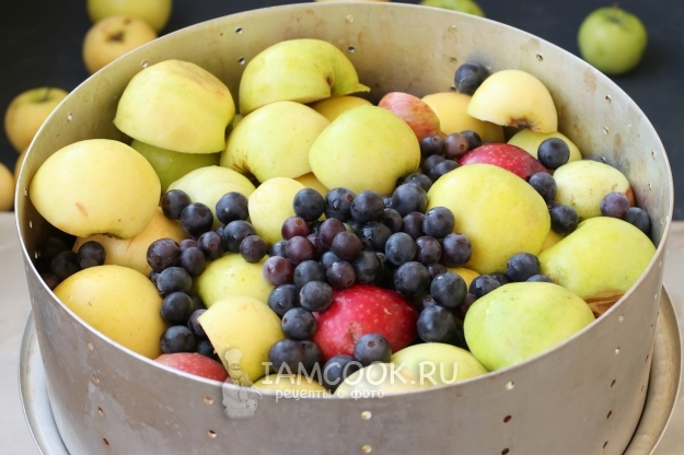 Сверху установить чашу и заполнить её яблоками и виноградом. После того, как все фрукты сложены, соковарку накрыть верхней кастрюлей и поставить на средний огонь. Резиновую трубку, сквозь которую будет вытекать сок, пережать зажимом.