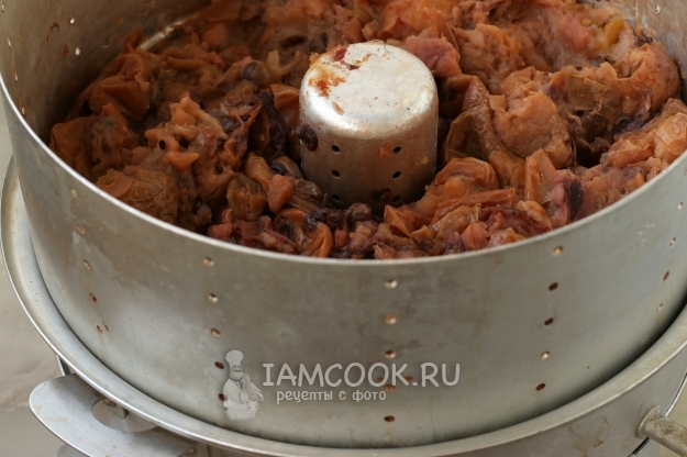 Через 2-2.5 часа, когда фрукты хорошо размягчатся, поднять крышку и перемешать всё содержимое. Со шланга снять зажим и сливать сок в кастрюлю.