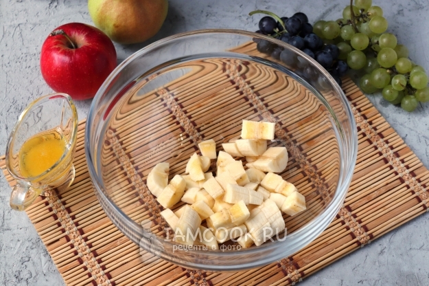 Очищенный банан нарежьте средними кубиками или кружочками, выложите в миску подходящего размера.