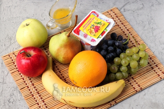 Для приготовления фруктового салата с йогуртом для детей подготовьте продукты по списку к рецепту. Фрукты и виноград помойте под холодной проточной водой и обсушите.