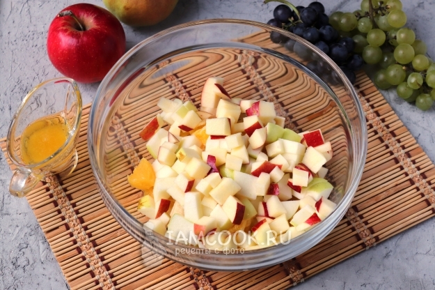 Яблоки, желательно разного цвета, не очищая, нарежьте кубиками и отправьте в салат.