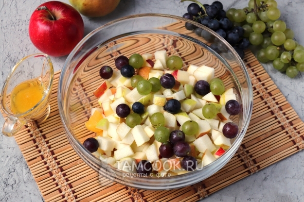 Таким же способом, как и яблоки, нарежьте грушу. Вместе с виноградом добавьте в миску к остальным ингредиентам.