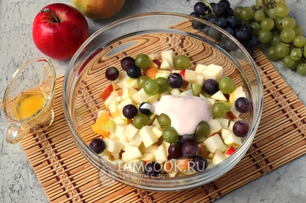 Вкусный и полезный фруктовый салат с йогуртом для детей готов. Переложите его в небольшие салатницы или креманки и сразу же подавайте на стол.