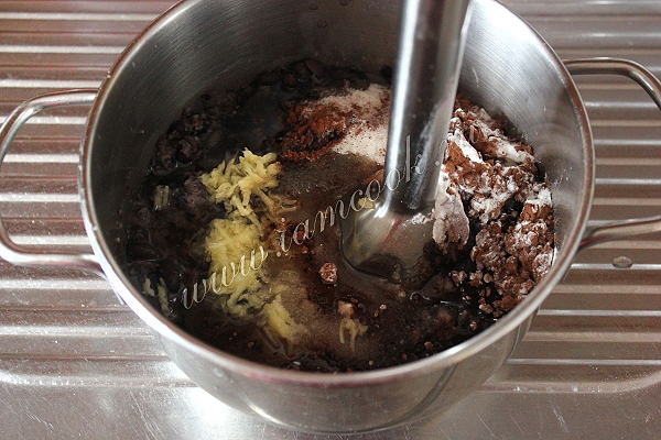 Добавьте растительное масло, сахар, ванильный сахар, муку с разрыхлителем, солью, какао и корицей, тёртый корень имбиря.