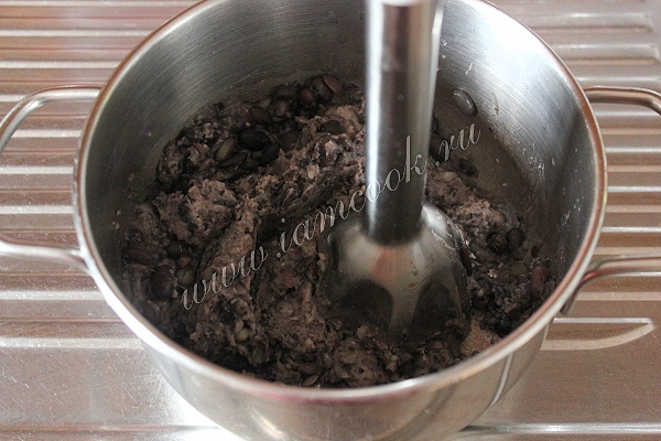 Фасоль замочите на 4 и более часов, затем сварите до готовности или даже чуть разварите и измельчите её насадкой блендера.