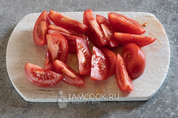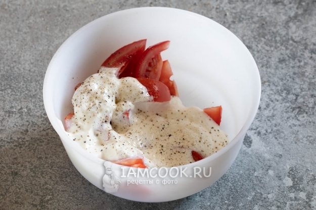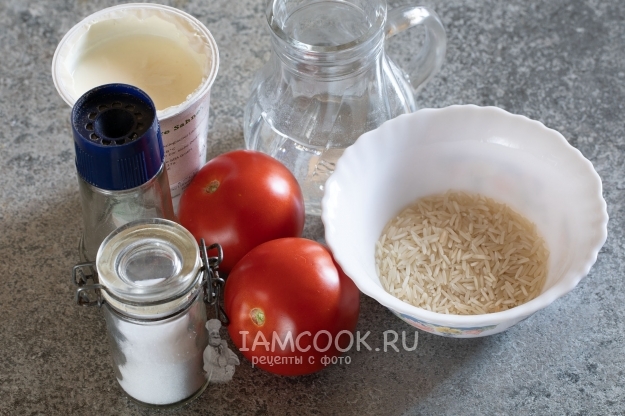 Рис пока еще не сварился, делать-то все равно нечего, поэтому помидоры можно приправить сметаной, солью и перцем. Соотношение ингредиентов - всегда абсолютно произвольное, лишь бы в наличии были они все.