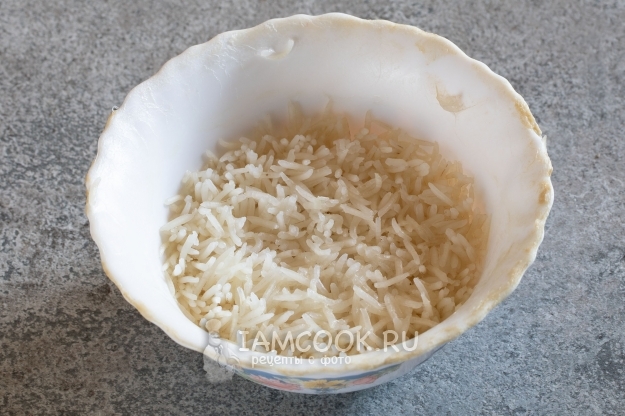 Для моего салата рис обязательно должен быть горячим, это принципиально. С холодным получается не то. То есть рис или нужно варить свежий, или подогревать остывший. Я тут варю басмати в тройном объеме воды в микроволновке на режиме 800 Вт 10 минут.