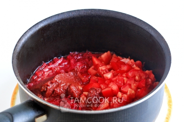 Как только свекла станет мягкой, добавьте в сотейник помидоры и томатную пасту. Посолите. Томатная паста может быть совершенно не кислой, такая мне встречалась повсеместно на Украине. Пробовала разные марки, но паста не та. В таком случае добавьте еще щепотку лимонной кислоты или ложку столового уксуса.